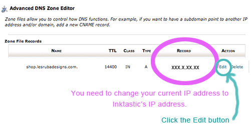 7. A few fields will open up underneath. Change the existing IP address to Inktastic’s IP – 38.113.112.144. Then click ‘edit record’ and you’re done.