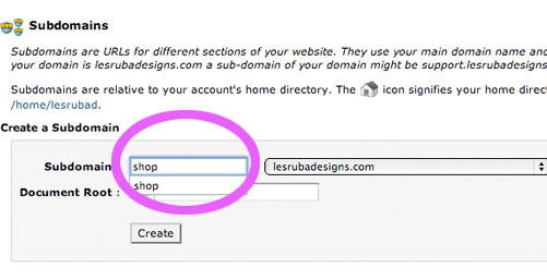 4. Name your subdomain – it can be something like shop, store, inktastic, etc. Click ‘create’.