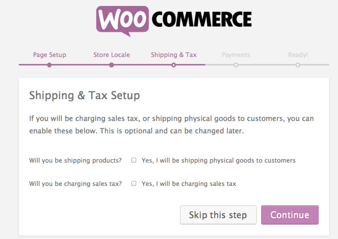 2. The first step is “Page Setup” where WooCommerce will create the necessary pages for your site including Shop, Cart, Checkout, My Account. Click “Continue” –